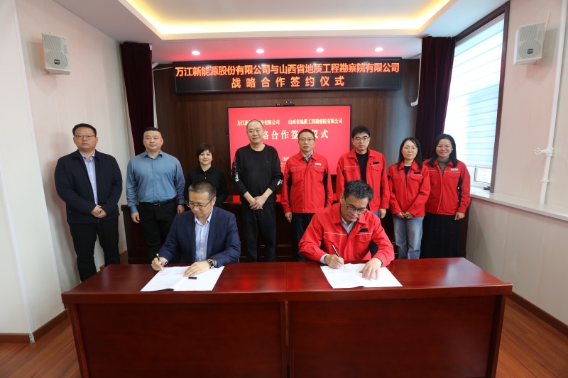 在战略合作签约仪式上,施红政对万江新能源股份有限公司的到来表示热烈欢迎,并着重从历史沿革、业务范围、生产经营及重点项目、创新平台建设、对外合作等方面介绍了公司基本情况。尹永旺从技术、市场、资金等方面对万江新能源股份有限公司做简要介绍。期间,双方共同观看了《地勘院有限公司宣传片》《万江新能源股份有限公司宣传视频》,还就政策要求、市场前景、市场开发经验等方面进行探讨研究。