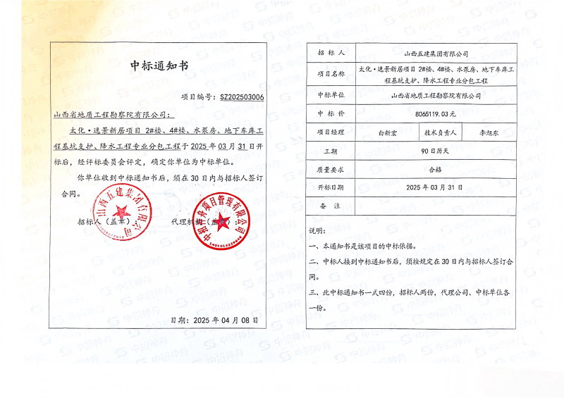 4月8日,我公司中标太化·逸景新居项目2#楼、4#楼、水泵房、地下车库工程基坑支护、降水工程专业分包工程项目。中标工程内容为基坑支护桩施工、止水帷幕施工、基坑降水施工等工程,中标价806.51万元,合同工期90日历天。中标任务由公司下属的生态环境公司承建。
