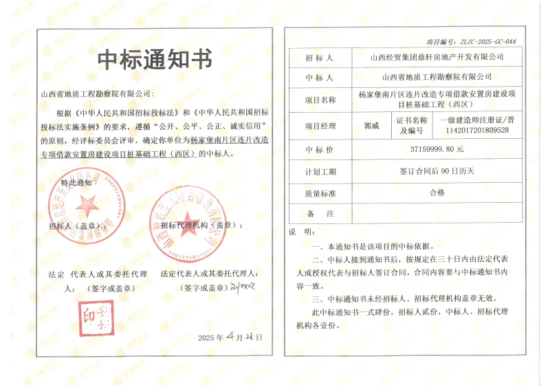 4月28日,问鼎网页版登录入口下属岩土工程公司中标杨家堡南片区连片改造专项借款安置房建设项目桩基础工程(西区)项目,中标价:37159999.8元。